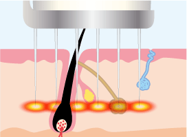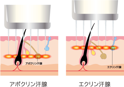 ニオイの元となるアポクリン汗腺と、汗の元となるエクリン汗腺は皮下組織の中に存在する深さがそれぞれ違います。2つの汗腺を効率的に破壊するため、ビューホットのカートリッジに内蔵されている針で深さを変えながら、高周波による熱を浸透させて汗腺にダメージを与えています。